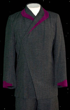 Description: This costume was worn by an ‘Entharan' in the Star Trek: Voyager episode “Retrospect”. The double breasted jacket is gray with white pin stripes and purple trim on the collar and cuffs. The pants are also gray with white pin stripes. Costume comes complete with costume tag.