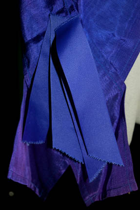 Description: The Khitomer Conference was featured in “Star Trek VI – The Undiscovered Country” and was the first complete peaceful negotiations between the United Federation of Planets and the Klingon Empire. It ultimately led to the signing of the Khitomer records that began almost a century of peace between the two factions. The factions were designated different colored sashes to identify them. This is a blue Federation sash that goes over the shoulder and has attached ribbons at the bottom. Due to time and storage the sash is fading to a shade of purple in some sections.