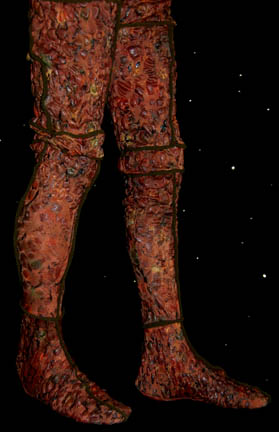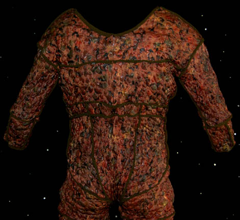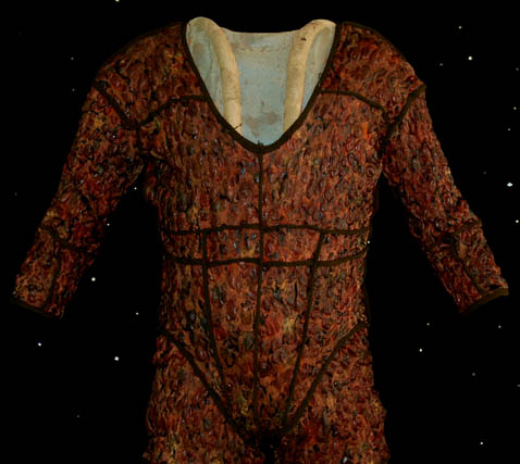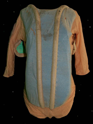 Description: The first alien to come through the wormhole to the Alpha Quadrant in Star Trek: Deep Space Nine turned out to be a mysterious being that was being pursued by alien hunters. “Tosk” (Scott McDonald) would not reveal the truth of his predicament until after the hunters arrived and battled the Bajoran and Starfleet crew to get to him. This is the costume of Tosk, a padded body suit made to give him an alien appearance, form fitting pants with attached feet made from rubbery bubbled fabric and a corresponding top with cropped sleeves. The lot contains the leggings of the principle costume, and the full stunt version of the costume as well as additional separate padding. The costumer's tags read ‘#406 DS9 “Captive Pursuit” Tosk, Scott McDonald’ and ‘#406 DS9 “Captive Pursuit” Stunt tosk, Tom Morga’. Scott McDonald was a veteran to Star Trek: The Next Generation having appeared as the Romulan “N’Vek” in “Face of the Enemy” and would go on to play a variety of characters including “Mr. Rollins” in Voyager’s pilot episode “Caretaker” and the Xindi-Reptillian “Commander Dolim” in Enterprise.