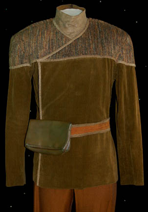 Description: A four piece costume from the collection of “Tuvok” (Tim Russ) consisting of dark orange pants, a green jacket with an asymmetrical front and pleating to create ribbing around the shoulders the body and sleeves of which are mustard colored corduroy, a leather dickie attached to a sleeveless undershirt, and a leather belt with a flap pocket pouch topsticked closed. The costumer's tag reads ‘Tuvok, Tim Russ, Voyager’.