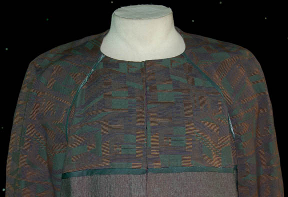 Description: The “Trill” are a humanoid species from the planet Trill, similar in appearance to humans however they have two rows of spots going down each side of their bodies from their heads to their toes. This is a Trill Doctor costume featured in the Star Trek: Deep Space Nine episode “Equilibrium”. The doctor worked for the Symbiosis Commission but was murdered by the Trill, Joran Dax. The long purple coat has a patterned torso and sleeves with turquoise trim and snaps at the front. The matching pants are also purple. Costume comes complete with costume tag.