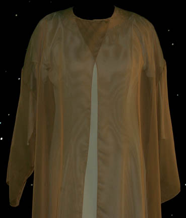 Description: The “Qomar” are a humanoid species known for their xenophobic and arrogant attitudes. Due to their vocal anatomy they are unable to produce musical notes and were therefore fascinated when they heard the “Doctor” (Robert Picardo) humming a tune in the Star Trek: Voyager episode “Virtuoso”. This is a female Qomar costume that includes a sage green jumpsuit with built in feet and a zip up the back. Worn over the top is a short sleeved sage green dress with slits up each side. The last layer is a shear light weight flowing robe with snaps at the neck. Sage green tights accompany the costume however they appear to be unused. Costume comes complete with costume tag.
