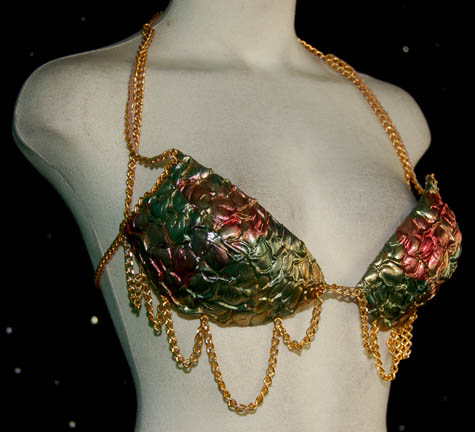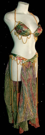 Description: When everyone's imaginations become reality in the Star Trek: Deep Space Nine episode “If Wishes Were Horses”, “Quark” (Armin Shimerman) finds himself surrounded by beautiful women. This sexy costume was worn by one of those women. The bikini costume is iridescent textured fabric in multiple colors with gold colored metal chains hanging off of it for decoration. A shear crimped multicolored wrap is worn loosely around the legs attaching at the waist to complete the look. Costume comes complete with costume tag.