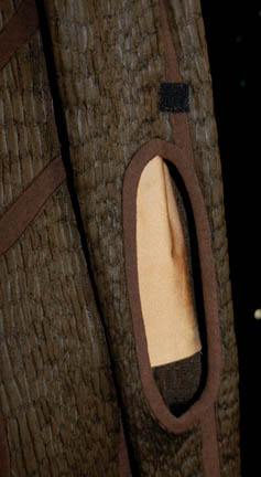 Description: A stunt costume featured in the Star Trek: Voyager episode “Distant Origin” for wear by a “Voth”, beings distantly related to dinosaurs from Earth. The costume is made up of a form fitting undershirt, a pair of matching padded trousers to give the wearer a distinctly alien appearance, a similar chest piece, and an outer jumpsuit made of brown colored faux reptile skin fabric with wavering trim accents. The costumer's tag reads ‘#165 Distant Origins, Dennis Madalone’ and is stamped ‘Voyager’.