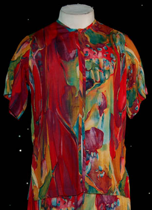 Description: A lot of three light shirts and a pair of matching trousers made for wear by actors portraying waiters and waitresses at ‘Sisko's Creole Kitchen’ in New Orleans, on Earth, in various episodes of Star Trek: Deep Space Nine like “Homefront” and “Paradise Lost”. The costumes are zip front shirts with tie died patterns in multi-colored blotches, reds, yellows, greens, and blues. They feature costumer’s tags reading ‘David Levinson’, ‘Jack Janda’, and ‘Shannon Thorton’. The trousers costumer’s tag reads ‘Paul Lewis’.
