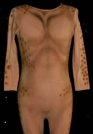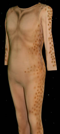 Description: “Neelix” (Ethan Phillips) was a Talaxian who served as a chef onboard the U.S.S. Voyager. This great body suit was worn by him during the first Star Trek: Voyager episode of the series, “Caretaker”. It was used to give Neelix's skin a Talaxian appearance during the bath scene where he was goofing off and splashing around until “Tuvok” (Tim Russ) walked in on him! The bodysuit is rose colored with brown air brushed Talaxian spots over the back, arms, legs and sides. Chest definition is also air brushed on. The sewn in tag reads “Voyager – Ethan Phillips”. Costume comes complete with costume tag.