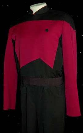 Description: A Star Trek: The Next Generation-style uniform featured in the Star Trek: Deep Space Nine episode “Emissary”, the first episode of the legendary series. “Commander Sisko” portrayed by Avery Brooks, first appeared on screen during the famous Battle of Wolf-359 as the executive officer of the “USS Saratoga” which was destroyed battling the Borg on their drive to assimilate Earth. During the events portrayed in “Emissary” Sisko also wore a Starfleet uniform like this until he became the commander of “Deep Space Nine”. The costume is a ‘class-a' Starfleet jacket with a Mandarin-style collar, colored command red with black shoulders and a black waist with black overalls-style trousers featuring sewn on ‘away team’ gear loops. The garments feature sewn in TNG tags reading ‘A. Brooks’ and the costumer’s tag reads ‘DS9 Pilot, Sisko, Avery Brooks, Class A Starfleet jacket’. The trousers were selected separately to complete the uniform as were the accompanying black leather ankle boots with inside zips. He boots are labeled ‘AB’ next to the inside of the zips and were located in a ‘Sterlite’ box labeled ‘SISKO, Avery Brooks’.