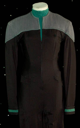 Description: “Jadzia Dax” (Terry Farrell) was a joined Trill who was a Starfleet lieutenant during the Star Trek: Deep Space Nine series. This costume is her Starfleet uniform that includes a black jumpsuit with gray quilted shoulders ,green trim around the cuffs and a zip up the front. Worn underneath is a sciences green sleeveless top that zips up the front and has a built-in leotard bottom. The inside tags read “Deep Space Nine – Terry Farrell” and costume comes complete with costume tags.
