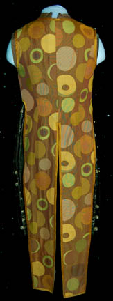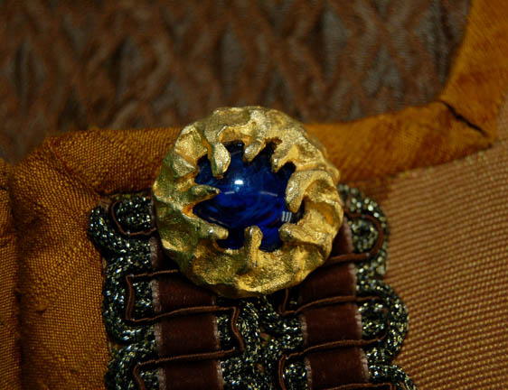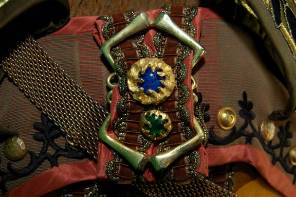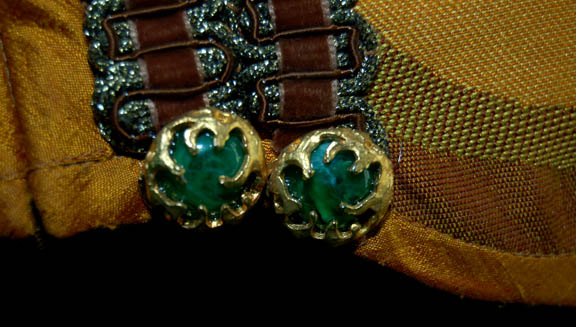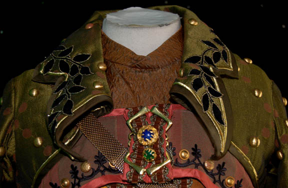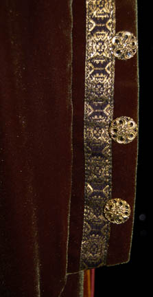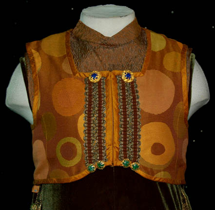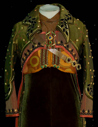 Description: “Nilva” (Henry Gibson) was a Ferengi Commerce Authority commissioner and the chairman of the Slug-o-Cola company featured in the Star Trek: Deep Space Nine episode “Profit and Lace”. He was the only Ferengi who agreed to travel to Deep Space Nine to hear “Ishka” (Cecily Adams) talking about the benefits of allowing the unheard of scenario of a Ferengi female making profit. The elaborate costume includes a green sleeveless velvet jumpsuit has the traditional Ferengi wings down each pant leg with gold and black ribbon trim and gold colored buttons. Due to time and use some of the buttons are missing however a back of extra ones is included. A cropped brown top with diamond shaped detail is worn over the top followed by a cropped waistcoat with full length tails in the back. The waistcoat is brown with a circular design and ribbon down the front. It also has six gold and green accents around the centered zip. The final, most impressive layer is the robe with a cropped waist, long tails and a metal decorative clasp in the front. Resin and metal gold colored studs decorate the robe as well as a leaf design made of gold trimmed black velvet. A gold colored metal chain sash passes over the left shoulder ending in a metal and purple jeweled clasp. Costume comes complete with costume tag.