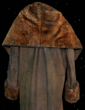 Description: A large fur lined leather costume coat featured in the Star Trek: Voyager episode “Live Fast and Prosper” for wear by “Varn” (Ted Rooney), an alien who bought into a con to join the Federation by thieve pretending to be the crew of “Voyager”. The coat is practical and extremely large with an oversized collar and no center seal. The costumer's tag reads ‘242 Live Long and Prosper, Varn, Ted Rooney’.