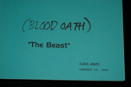 Description: A script for the episode “Blood Oath” of Star Trek: Deep Space Nine, formerly titled “The Beast”. This first draft script is the basis for the legendary return of “Kor” (John Colicos), “Kang” (Michael Ansara), and “Kolos” (William Campbell) to Star Trek as elder Klingons on a mission of vengeance against the murderer of their three firstborn children alongside “Jadzia Dax” (Terry Farrel). The 58 page script has a blue-green cover with the title “The Beast” printed on it as well as ‘First Draft, January 10, 1994', and penned in above it’(BLOOD OATH)’. The script features multiple colored pages indicating revisions of lines or scenes and indicates the episode was written by ‘Peter Allan Fields’ and directed by ‘Rick Kolbe’.