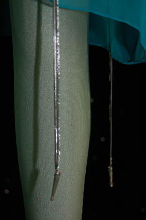 Description: The “Qomar” are a humanoid species known for their xenophobic and arrogant attitudes. Due to their vocal anatomy they are unable to produce musical notes and were therefore fascinated when they heard the “Doctor” (Robert Picardo) humming a tune in the Star Trek: Voyager episode “Virtuoso”. This is female Qomar “Tincoo's” (Kamala Dawson) costume that includes a sage green jumpsuit with built in feet and a zip up the back. Worn over the top is a sleeveless sage green dress. The last layer is a shear light weight flowing teal robe with snaps at the neck. Sage green tights accompany the costume as well as a thin silver and black belt with metal tips. Costume comes complete with costume tag.