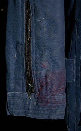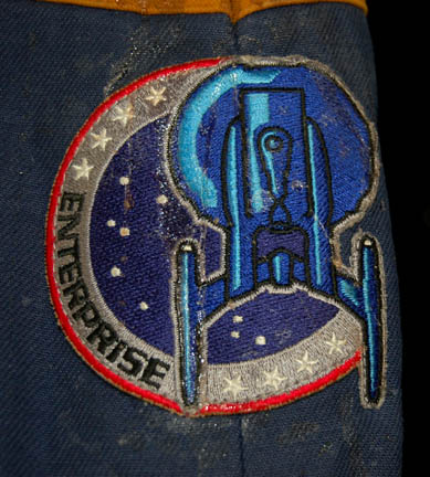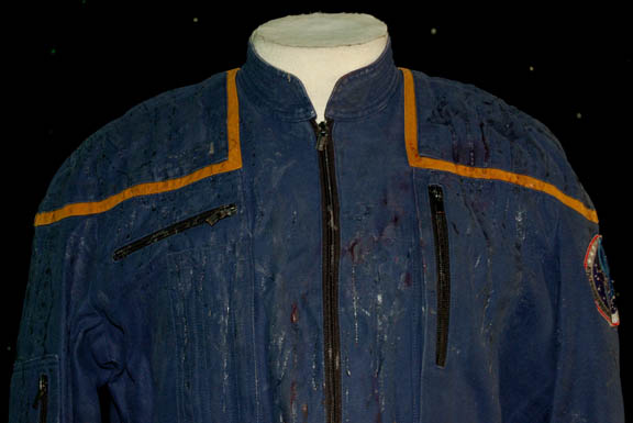 Description: A costume featured in the Star Trek: Enterprise episode “Hatchery” for wear by Scott Bakula during his portrayal of “Captain Archer”. During their hunt for the mysterious Xindi, the crew of the “Enterprise NX-01” comes across a downed Xindi-Insectoid ship and Captain Archer is sprayed by an alien egg thus altering his mind to take a more parent-like approach to handling the hatchery. As the eggs hatch the baby Xindi-Insects crawl all over Archer his uniform is covered with dripping special effects ‘goop', still present here in its dried form for a one of a kind distressed uniform. The costume is a blue Starfleet Enterprise-style jumpsuit with multiple zippered pockets and the famous “Enterprise NX-01” assignment patch sewn onto the left shoulder. The costume has command gold division piping and the sewn in Enterprise tag reads clearly ‘Scott Bakula’ while the costumer’s tag reads ‘Archer, Scott Bakula, #A06, Starfleet Uniform, Distressed’.