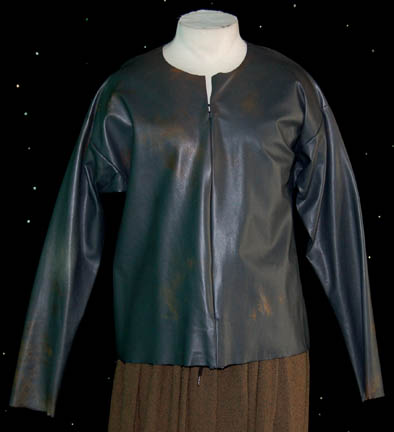 Description: The Coridans are a humanoid species from a dilithium rich planet located in the Bete Quadrent. Featured in the Star Trek: Enterprise episode “Shadows of P'Jem”, a group of Coridan rebels took “Captain Archer” (Scott Bakula) and “T’Pol” (Jolene Blalock) prisoner while they were on an away mission to the war torn planet Coridan. The top is black vinyl with a zip up the front and intentional brown distress over the surface. The brown parachute pants have a draw string waist and frayed cuffs.