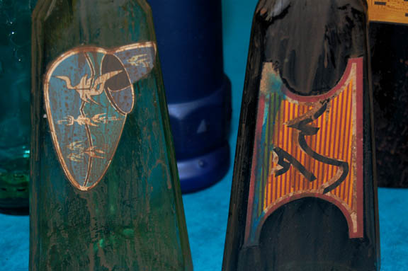 Description: A lot of seven alien bottles featured in various episodes of Star Trek. The bottles are of various shapes and sizes. Two are vaguely triangular with an application and a cork, one has opaque fluid and the other has dark, another bottle is made from blue glass, sealed with a fluid within, one bottle is a tall flat bottle of nearly clear glass, another has an alien iconographic symbol and script, there is a second blue bottle and a green bottle with molded fruit accents. The largest bottle measures approx. 13 X 5 X 2 inches and the smallest measures approx. 11.25 X 3 in diameter.