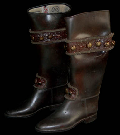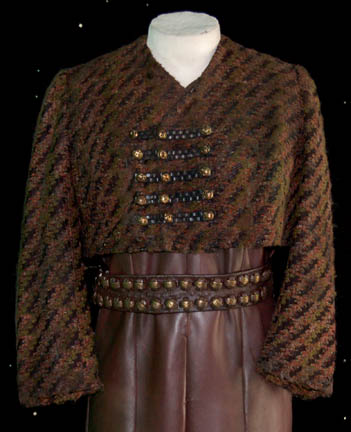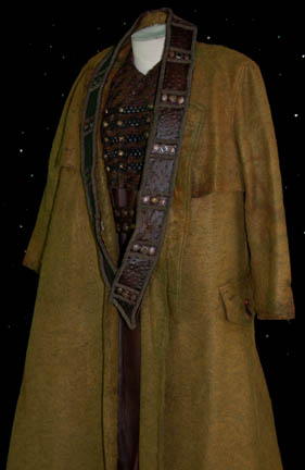 Description: “Ulis” played by veteran Star Trek actor, Ethan Phillips, was a Ferengi pirate featured in the Star Trek: Enterprise episode “Acquisition” in which Ulis and a group of Ferengi pirates knock out the entire crew of the U.S.S. Enterprise NX-01 in order to loot the ship. Two other famous Star Trek veteran actors also played Ferengi pirates in this episode including, Clint Howard as “Muk” and Jeffrey Combs as “Krem”. Unfortunately for the Ferengi, “Commander Trip Tucker” (Connor Trinneer) is unaffected and their plans are foiled. It should be noted that the Ferengi never identified themselves to the crew of the Enterprise NX-01 and therefore it wasn't considered ‘first contact’ with the species. The Ferengi and humans wouldn’t make first contact until the Star Trek: The Next Generation episode “The Last Outpost”. The costume includes a brown vinyl sleeveless jumpsuit that zips up the back and a woolen striped and multicolored cropped jacket with fifteen metal buttons across the chest. An elaborate harness made of brown leather with numerous metal and resin buttons wraps around the waist and over the shoulder. The long fleece coat is earth tone colors with two coattails in the back that culminate in large knots. There is a stylized flap in the back, faux pockets and copper color metal accents attached to wooden buttons on the front. The coat is distressed intentionally to give a worn and used appearance. Brown distressed leather gloves and brown decorated vinyl boots are also included. Costume comes complete with costume tag.