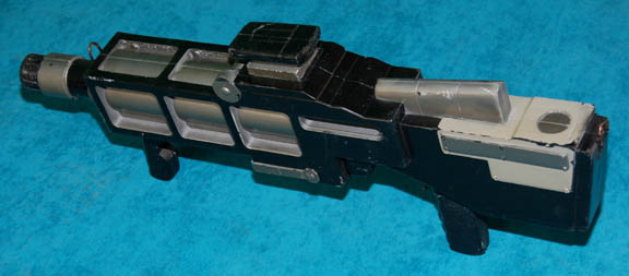 Description: A prop hand weapon featured in the Star Trek: Enterprise episode "Extinction". As “Captain Archer” (Scott Bakula), “Lt. Reed” (Dominic Keating), and “Ensign Hoshi Sato” (Linda Park) are infected with a virus that devolves them into a native of the planet they are exploring. While “T'Pol” (Jolene Blalock) attempts to remind them of their natural state, an alien species arrives to eliminate any traces of the virus. The item is one of the containment alien flamethrowers, a cast rubber prop weapon with metallic silver and black painted accents measuring approx. 26 X 7 X 3 inches.