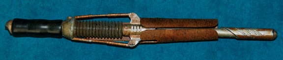 Description: A prop used by multiple aliens in multiple episodes, but featured specifically by Klingons in the Star Trek: Enterprise episode "Judgment", and by Tandorans in "Detained". Item is cast rubber with a black vinyl handle, with "metal" accents, and holster that clips to the belt. Dimensions are approx. 24 X 3 X 2 inches.