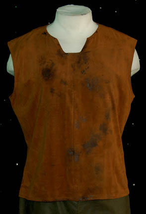 Description: The Nausicaans are a humanoid species who appeared in multiple episodes of Star Trek. This costume was worn by a Nausicaan prisoner (D. Elliot Woods) in the Star Trek: Enterprise episode “Fortunate Son” in which the U.S.S. Enterprise NX-01 assists an Earth freighter, ‘Fortunate Son', that’s supposedly been attacked by Nausicaan pirates. The costume includes a brown faux leather jacket with raised patterned bumps and pleated trim around the shoulders and sleeves. Worn underneath is a brown sleeveless top with distress to the front. The brown pants are also slightly distressed and have two patches attached to the front. Costume comes complete with costume tag.