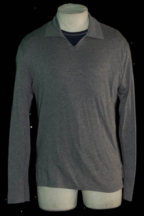 Description: A lot of clothing representing the costume changes of “Captain Archer” as portrayed by Scott Bakula in the Star Trek: Enterprise episode “Carpenter Street”. As the crew of the “Enterprise NX-01” searches for the mysterious Xindi, a messenger in the night reveals that the aliens have traveled back in time to 2004 in the city of Detroit, on Earth to collect data on humans for use in a biological weapon. Archer and “T'Pol” (Jolene Blalock) are sent back to the same period to confront the Xindi, thus wearing ‘period’ clothing. The lot consists of a blue colored undershirt with thick white stitching by ‘Armani Exchange’ with a sewn in Enterprise tag reading ‘Scott Bakula’ and an elaborate reversible jacket with multiple functional pockets, a reversible collar with black felt on one side, and a dual lined button front worn during scenes taking place both on “Enterprise” and in the year 2004, and a form fitting gray long sleeved shirt with a collar and a sewn in Enterprise tag reading ‘Scott Bakula’ which was produced by ‘Mani’ representative of the scene in the galley during which “Daniels” (Matt Winston) reveals the Xindi time travel plot. The jacket is ‘Polo by ‘Ralph Lauren’ and features a sewn in Enterprise tag reading ‘Scott Bakula’.