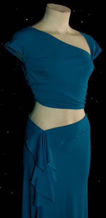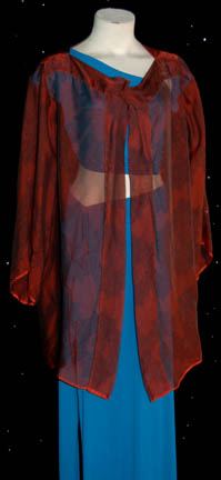 Description: “Keyla” (Dey Young) was a mystifying woman that “Captain Archer” (Scott Bakula) encountered while vacationing on the planet Risa in the Star Trek: Enterprise episode “Two Days and Two Nights”. She turned out to be a Tandaran who Captain Archer believed to be working for “Colonel Grat” (Dean Stockwell) however she rendered Archer unconscious and disappeared before the truth was found out. This is her blue outfit that includes a cropped top that snaps on the left side and a blue flowing skirt with a sexy slit up to the thigh. A flowing brown chiffon top with a floral design is also included. The sewn in tags read “Enterprise – Day Young, #25”.