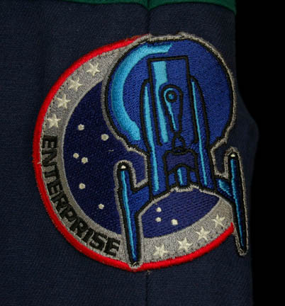 Description: A Starfleet uniform jumpsuit with sciences blue division strips around the shoulders and multiple zippered pockets made for wear on various episodes of Star Trek: Enterprise. The costumes zips up the front and features a black sleeveless button front undershirt, and Velcro and zip size adjustments at the ankles and cuffs. The left shoulder features the famous “Enterprise NX-01” assignment patch and the uniform comes with a sewn in Enterprise tag and a costumer's tag indicating use by various actors.