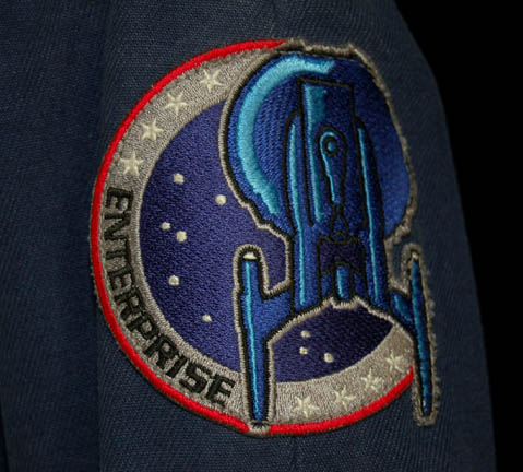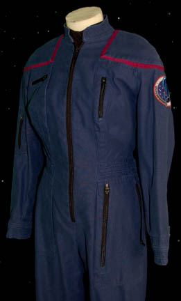 Description: A Starfleet uniform jumpsuit with engineering red division strips around the shoulders and multiple zippered pockets made for wear on various episodes of Star Trek: Enterprise. The costumes zips up the front and features a black long sleeve button front undershirt, and Velcro and zip size adjustments at the ankles and cuffs. The left shoulder features the famous “Enterprise NX-01” assignment patch and the uniform comes with a sewn in Enterprise tag and a costumer's tag indicating use by various actors.
