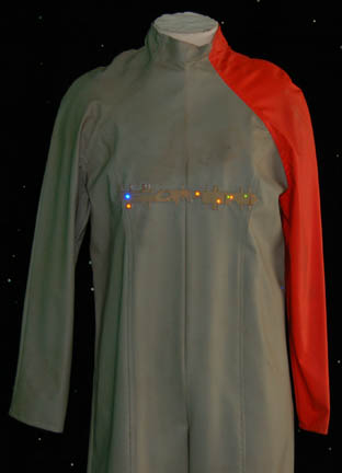 Description: The U.S.S. Voyager's first encounter with the Nygean species was in the Star Trek: Voyager episode “Repentance” in which the Voyager rescued one of their prison ships and passengers. This costume was worn by a Nygean prisoner and includes a sage green vinyl jumpsuit with an orange left sleeve and a zip up the back. Across the chest is a geometric rubber panel with built in LED lights of various colors. They are activated by a standard 9volt battery worn on a belt under the suit. Due to time and use, three of the lights appear not to be in working order. Costume comes complete with costume tag.