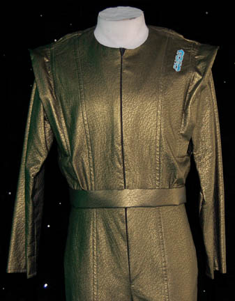 Description: Captured by a massive industrial consortium and brainwashed into believing that they have been part of the employees of this company forever, the crew of “Voyager” wore jumpsuits like this one in the episodes “Workforce, Parts I and II” of Star Trek: Voyager. A shiny green jumpsuit with a matching belt, a zip up the front, and a white sewn in division patch on the left shoulder front depicting ‘Quarren' character letters. Made by ‘MUTO Little, Los Angeles’ the costumer’s tag indicates use in the episode “Workforce”.