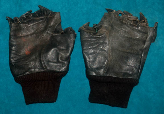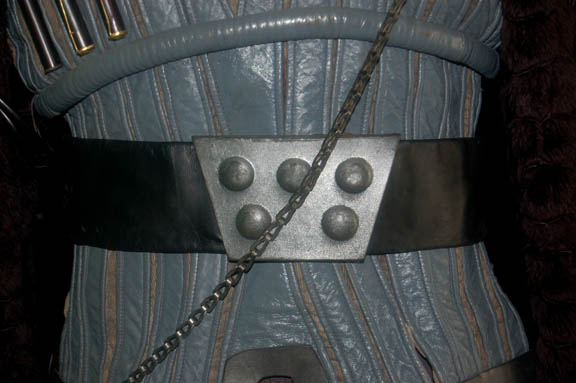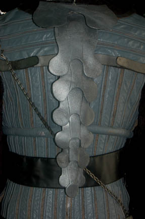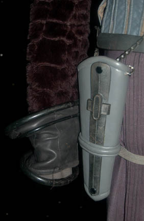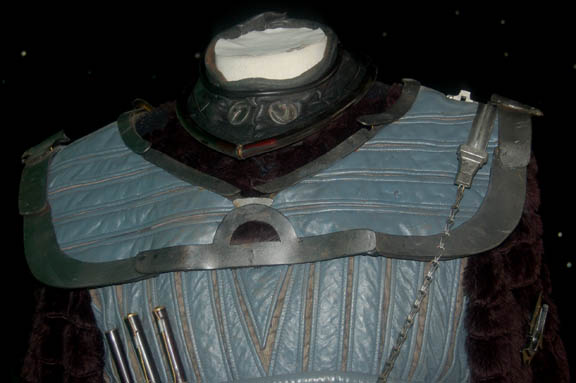 Description: Having been captured by a Hirogen hunting group who are utilizing the holodeck on “Voyager”, the crew have been brainwashed into performing countless acts of defense against their captors in multiple holographic environments. “Neelix” (Ethan Philips) wears this feature films style Klingon uniform costume in the episode “The Killing Game, Pt. II” when he is approached in a Klingon battle scenario. Brainwashed into believing he is a Klingon, he wears this legendary costume well. With gray spandex pants, and a gray uniform top with black synthetic fur sleeves which have Velcro placements for Klingon costume accessories including a cast resin communicator badge, a black leather gorget with insignia, leather fingerless gloves, gauntlets, a multi-piece resin spine piece, a metal aglet and chain for included leather disruptor holster, ammo case, belt with resin buckle, and a costumer's tag that reads ‘Klingon, Complete Outfit’. Sewn in interior Voyager tags read ‘Ethan Phillips’ in the pants and uniform top, a label sharing space with multiple other tags indicating use by various actors in additional series.