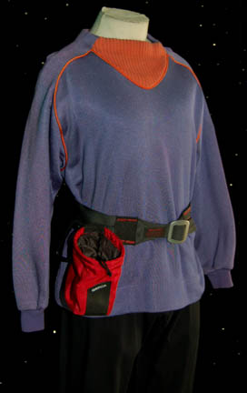 Description: A costume featured in Star Trek V: The Final Frontier for wear by William Shatner during his portrayal of “Captain Kirk” during opening scenes as he was climbing ‘El Capitan' in Yosemite National Park. The costume is made up of a black trousers with neon green piping flairs below the knee, and a purple sweater with orange piping and an orange collar in the front and back of the neck with a minute amount of distress in the front. The lot also comes with black colored climbing shoes with the ‘Boreal’ name brand inscribed on the sole, a flap that covers the laces by way of snaps and Velcro and a costumer’s tag indicating the shoes are for blue screen use. The costume features a black nylon climbing belt with a silver colored metal buckle, a black Carabiner with a silver colored screw lock, and a red nylon chalk bag with a draw string seal. The costumer’s tag reads ‘Star Trek V, William Shatner as Capt. Kirk CHG #1’ and the sewn in tag inside the trousers reads ‘Shatner, blue screen’. Due to time and storage conditions the orange element in the sweater shows signs of settled dust.