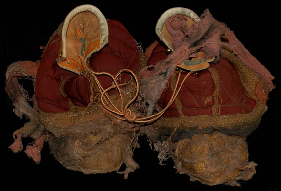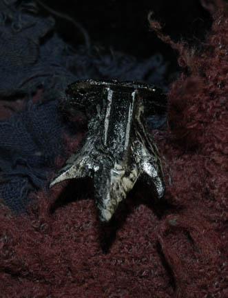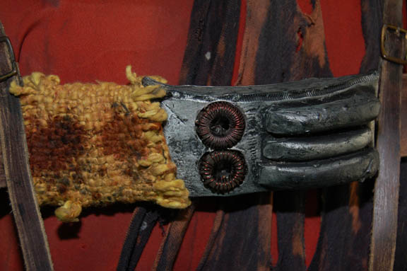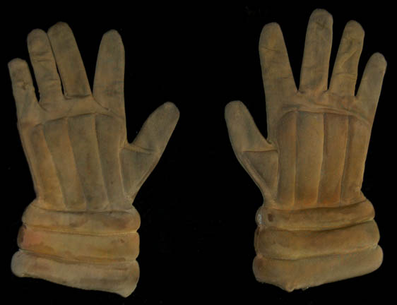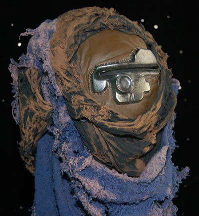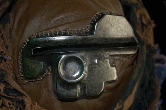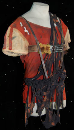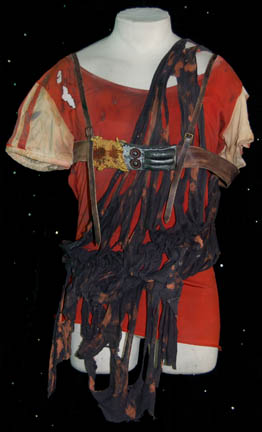 Description: A costume lot featured in Star Trek II: The Wrath of Khan for wear by Fletcher Bryant in his portrayal as one of “Khan's” (Ricardo Montalban) genetically engineered henchmen. The costume is a trio of shirts in various states of distress, one being a stunt double shirt, all of them with a black colored tattered wrap. A leather harness with a dulled metallic silver colored resin buckle is present for wear across the chest, as are brown leather boots covered with affixed rags, a single glove made to match the boots with a disconnected but accompanying claw, and a pair of distressed to appear stained gloves, colored tan with padding to appear futuristic and spacey. The costume also includes a leather face mask with a metallic silver colored plastic ‘eye piece’ with a slit cross the eyes with attached rags for wear over the costume when the character was on expeditions outside of the crashed “SS Botany Bay”.