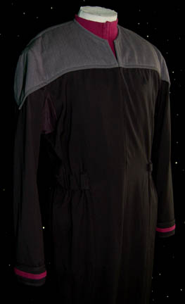 Description: A costume featured in Star Trek X: Nemesis for wear by “Commander Riker” as performed by Jonathan Frakes. The costume is a black Starfleet uniform jumpsuit with gray quilted shoulders, sewn on ‘away team' gear loops at the waist, and command red division strips sewn onto the cuffs with a command red sleeveless undershirt. Both garments feature sewn in tags reading ‘Jonathan Frakes’, the undershirt also reads ‘Riker’.
