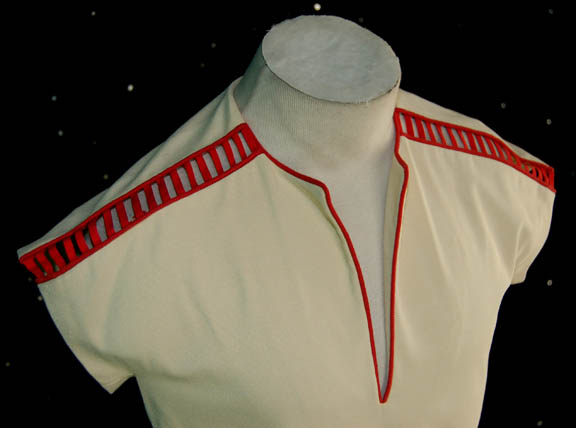 Description: A costume tabard featured in Star Trek II: The Wrath of Khan for wear by Regula I researchers during the development of Project Genesis. The item is an off white colored sleeveless shirt with symmetrical slits in the front at the waist and red trim around the collar with accompanying accents across the collarbones and the front of the shoulders. The item features a sewn in Western Costume Co. tag indicating ‘size 42'.