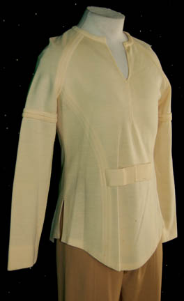 Description: A costume worn in various sequences of Star Trek I: The Motion Picture. Costume is a cream-colored, v-neck, short-sleeved, Class-B uniform shirt featuring an unattached bio-monitor and very minor spotting due to time and storage. Trousers are tan with Velcro clasp size adjustments on the ankle cuffs.