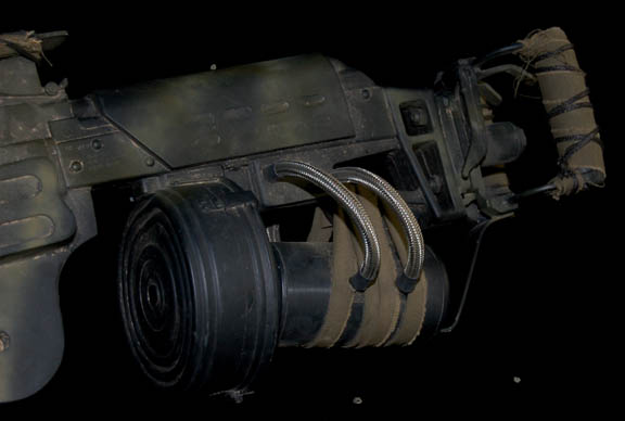 Description: Featured in the ‘ARGO' scene of Star Trek X: Nemesis during with “Captain Picard” (Patrick Stewart), “Data” (Brent Spiner), and “Worf” (Michael Dorn) comprised an away team to the planet ‘Kolarus III’. Investigating the possibility of another android like “Data” being present on the planet the away team was accosted by Kolaran natives, a reptilian alien whose limited technology lead them to drive surface vehicles like all terrain jeeps and buggies with top mounted energy weapons. This item is from one of those vehicles, a turret mounted prop gun made from multiple components of cast resin, metal, plastic, wood, mesh wiring, rope, and colored cloth. The item is painted to appear aged and dirt from the shooting location is still crammed within its crevices. The tip of the barrel is slightly bent. Measures approx. 40 X 12 X 6 inches.