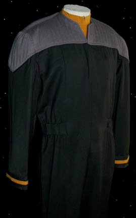 Description: A costume featured in Star Trek IX: Insurrection for wear by “Data” as performed by Brent Spiner. The costume is a black Starfleet uniform jumpsuit with gray quilted shoulders, sewn on ‘away team' gear loops at the waist, and operations gold division strips sewn onto the cuffs with an operations gold long sleeve undershirt. The undershirt features a sewn on tag inscribed ‘Data, Brent Spiner, Wet Suit’ while the jumpsuit features a sewn in tag reading ‘Data, H20, work stunts, dry suit’.