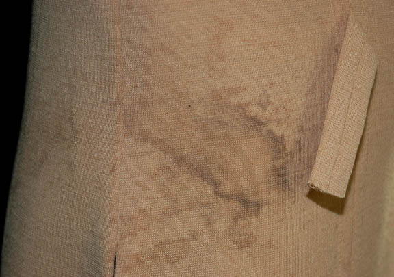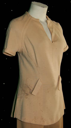 Description: A costume worn in various sequences of Star Trek I: The Motion Picture by "Lieutenant Commander Uhura" (Nichelle Nichols). A tan, short-sleeved, Class-B uniform shirt with slight staining due to time and storage, with corresponding trousers that have an inverse waistband. Tag on the shirt reads 'Nichelle Nichols, Uhura, TMP' whereas the trousers are not labeled.
