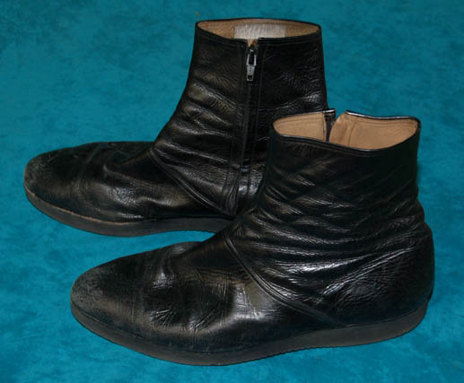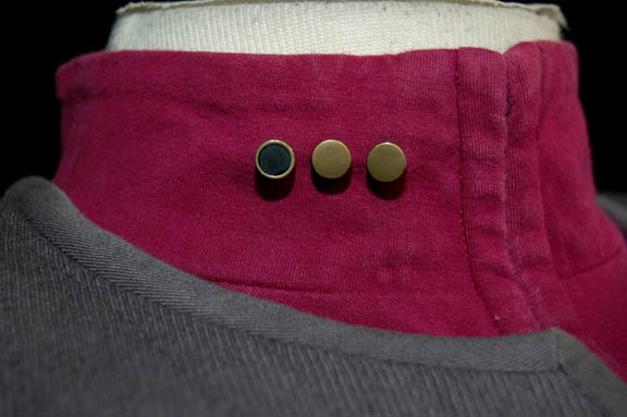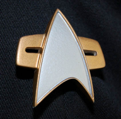 Description: A costume style featured in Star Trek: Deep Space Nine for wear by Michael Dorn in his performance as “Lieutenant Commander Worf” from the second part of the fifth season through the end of the series, and appearing in Star Trek: First Contact, Insurrection, and Nemesis. The costume is a black Starfleet uniform jumpsuit with gray quilted shoulders and command red division stripes around the cuffs, with sewn in ‘away team' loops at the form fitting elastic waist. The costume also comes with a command red division short sleeved undershirt with sewn in musculature in the chest, back, and arms for a more ‘Klingon’ appearance, with brass colored metal pins, one with a black painted fill, on the right side of the neck indicating the wearer to be a ‘lieutenant commander’ which were located with the costume, and a pair of black leather shoes with inscriptions of ‘M.D.’ and ‘WORF’. Also included is a metallic silver and metallic gold colored resin Starfleet combadge with an inscription on the reverse reading 'x65' for affixing to the black Velcro placement on the left breast of the jumpsuit that was not located with the costume for as complete as possible a representation of the character. The costume features sewn in Deep Space Nine tags inscribed ‘Michael Dorn’.