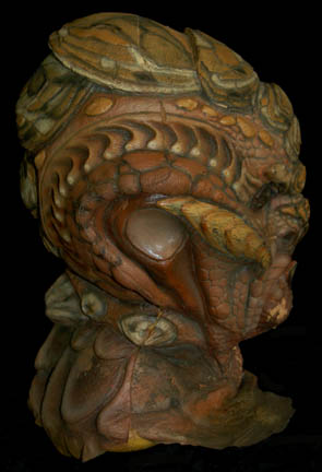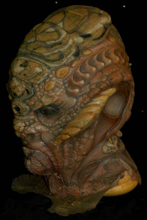 Description: This incredible piece of art is a complete Kolaran head from the Star Trek: Nemesis feature film. Although made of latex, this bust appears not to have been intended for use as a mask since it has been permanently attached to the supporting foam interior that helps it maintain its form. The eyes also have not been cut out, another indication that this was not intended to be an actual mask. That said the detail with which this piece has been made is exceptional. The subtle lines and grooves give the appearance of reptilian skin and the spray painted surface makes the head all the more lifelike. Measures approx. 15 ½ x 10 ½ x 10 ½ inches.