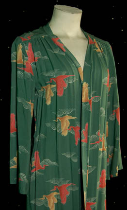 Description: “Uhura” (Nichelle Nichols) was the beloved Chief Communications officer onboard the U.S.S. Enterprise under the command of “Captain Kirk” (William Shatner) for almost thirty years. This robe was made for her for use during Star Trek III: The Search for Spock however it appears not to have made it into the final cut of the film. The robe is green with pink and yellow cranes flying against stylized clouds. The sewn in tag reads “Paramount – Nichelle ST III”.
