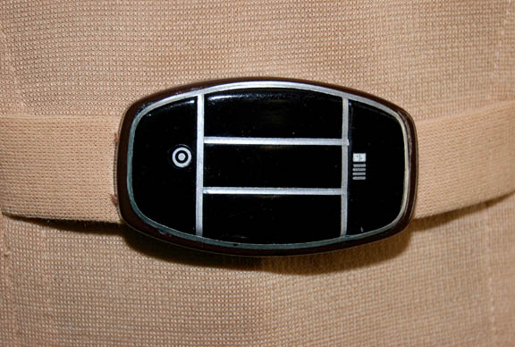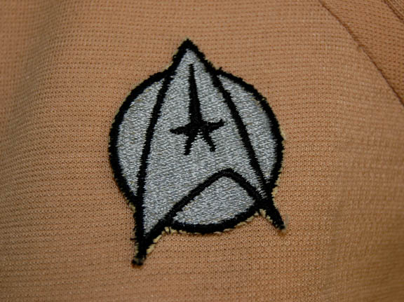 Description: A costume featured in Star Trek I: The Motion Picture for wear by actresses portraying female operations officers. The costume is a tan, long-sleeved, v-neck uniform shirt featuring an attached bio-monitor, affixed white division strips on the shoulders with embroidered gold bars indicating the rank of ‘lieutenant', a Starfleet insignia with silver backing denoting operations division, corresponding shoes and trousers with Velcro and clasp size adjustments on the ankle cuffs.