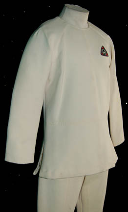 Description: A costume used in the "Epsilon IX" sequences of Star Trek I: The Motion Picture. The costume is a heavy-duty white long-sleeved shirt featuring an embroidered Epsilon IX patch on the left breast with corresponding white trousers in the overall style and stirrups for the feet.