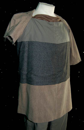 Description: A costume featured in the Star Trek: Voyager episode "Unity" where "Commander Chakotay" (Robert Beltran) is rescued and cared for by a band of former Borg humanoids. The costume is a grey mesh, sleeveless shirt, grey and black two-tone jacket minus the right arm, with a zipper up the front that is moderately distressed for appearance, and corresponding grey trousers. Sewn in tag reads 'Deep Space Nine, Craig Reed' and costumer's tag reads 'Unity #159 Voyager, Humanoid Amputee, Craig Reed'.