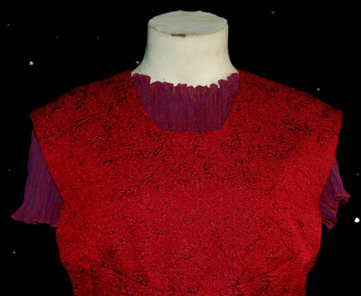 Description: A costume featured in various episodes of Star Trek: Voyager for Jennifer Lien in her role as "Kes". The costume is a sheer, slightly luminescent, violet "underdress", and a crimson dress with a flowery brocade, both of which have zippers going down the back. Sewn in tag reads 'Voyager, Jennifer Lien'.
