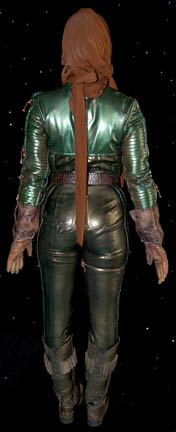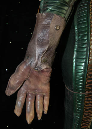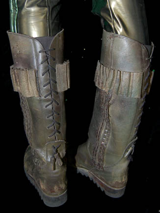 Description: A costume featured in the Star Trek: Voyager episodes “Gravity” for wear by Lori Petty in her role as "Noss", an alien woman with whom "Tom Paris" (Robert Duncan McNeil) and “Tuvok" (Tim Russ) were stranded on a deserted planet. The costume is a green iridescent vinyl jumpsuit with a v-neck, textured and gold colored string accented sleeves, stirrup feet, leather belt, holster, gloves, boots, and a brown cloth head wrap. Sewn in tag reads 'Voyager, Lori Petty' and is distressed to look as if "Noss" had been alone on the planet for years including a diagonal slash across the top of the left thigh.