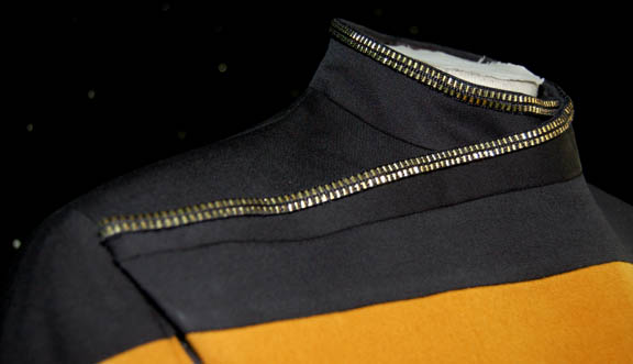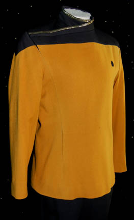 Description: A costume featured in the episode "One Small Step" of Star Trek: Voyager for wear by "Ensign Harry Kim" (Garret Wang). The costume is an operations gold Starfleet officer's dress uniform with gold accented collar and wrap around, zipper/button/clasps up the side, corresponding trousers, and clasps on the stirrups. The sewn in Voyager tag reads 'Garret Wang'.