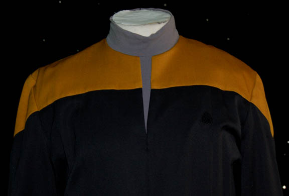 Description: A costume featured in the Star Trek: Voyager episode "Projections" for wear by Dwight Schultz in his role of "Reginald Barclay". The costume is a yellow on black, denoting operations or engineering, Starfleet uniform jumpsuit typical of the type used on Voyager with Velcro wrist cuff size adjustment, stirrups in the feet, a zipper up the front, a Velcro adhesive for a combadge (sold separately), and a grey turtle necked undershirt with a zipper down the back. The sewn in tag reads 'Voyager, Dwight Schultz'.