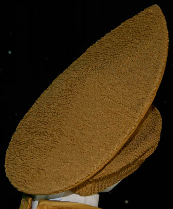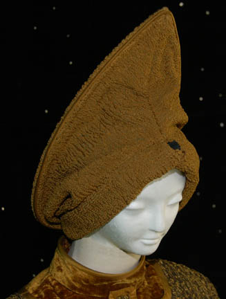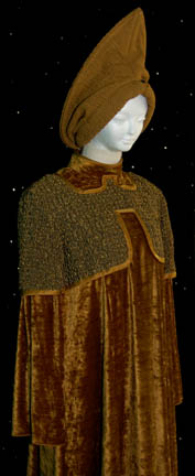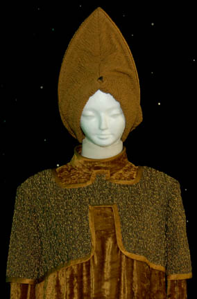 Description: A costume featured in the Star Trek: The Next Generation episode “Redemption” for wear by Whoopi Goldberg in her portrayal of “Guinan” during which she attempts to convince “Worf” (Michael Dorn) of his commitment to honor and the truth. The costume is textured trousers and crushed velvet top with shoulder accents that match the trousers in material. The costume also comes with a matching hat in the style familiar to Guinan, large and teardrop shaped. The sewn in tag on the trousers reads ‘Whooppi'.