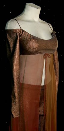 Description: A costume featured in the Star Trek: Voyager episode "Someone to Watch Over Me" by one of the holographic "alien babes" that was entertaining “Ambassador Tomin” (Scott Thompson) on the holodeck. The costume is a copper colored iridescent dress with a vinyl bust and sleeves, sheer, chiffon abdomen, and trousers of the same copper material and clasped stirrups. Sewn in tag reads 'Dene Doucette' but also reads 'Enterprise, Donna Marie Recco'.